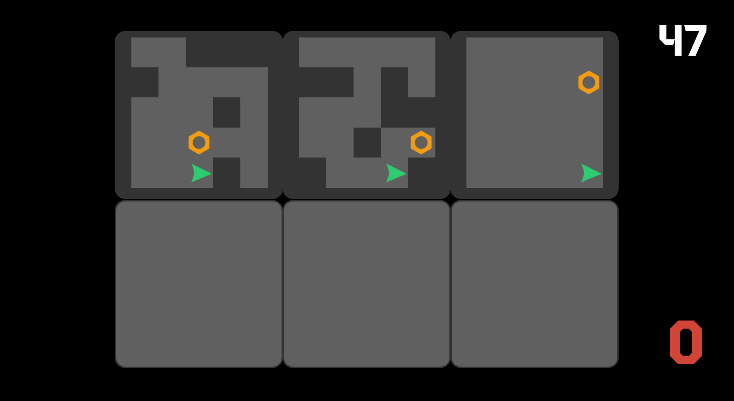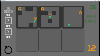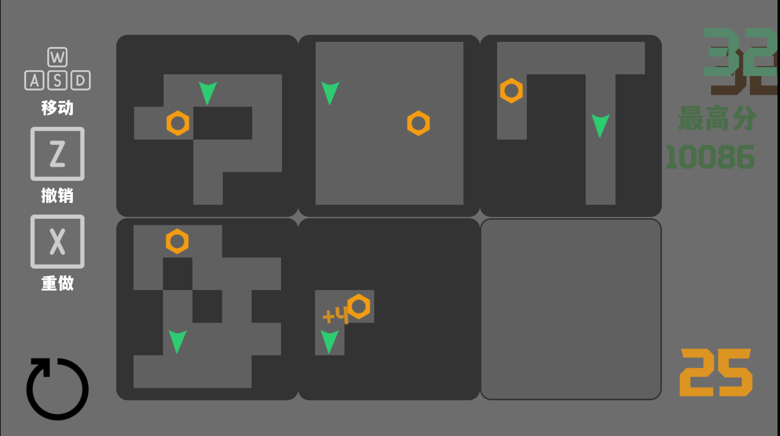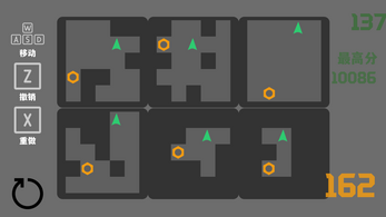 你将同时控制所有箭头,在随机生成墙壁的地图中前进,目标是让它们尽可能连续踩中六边形格子来获取奖励步数。